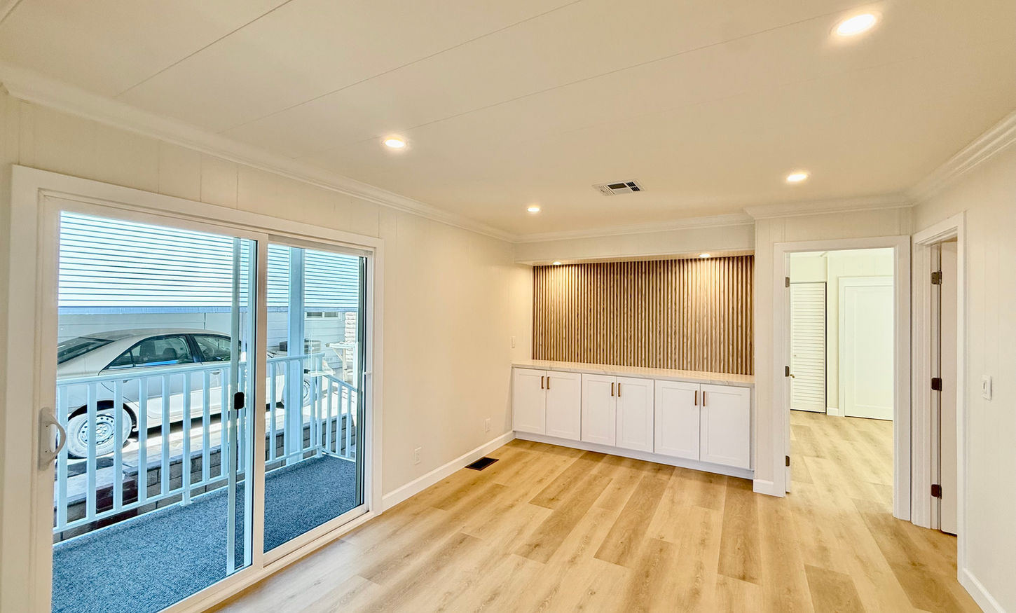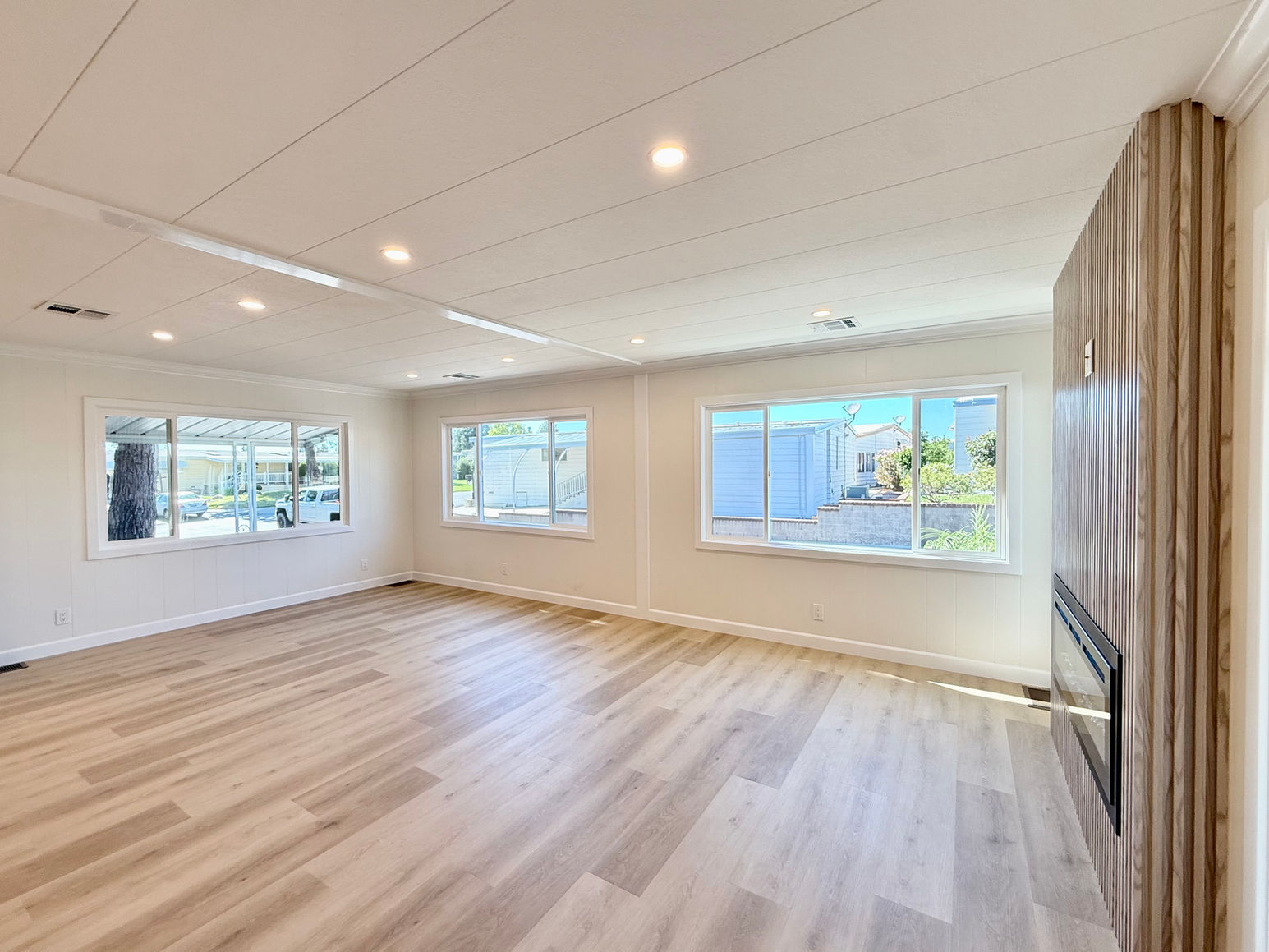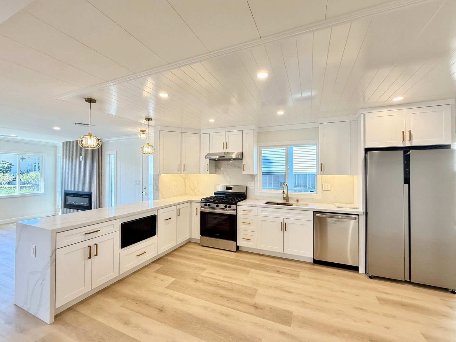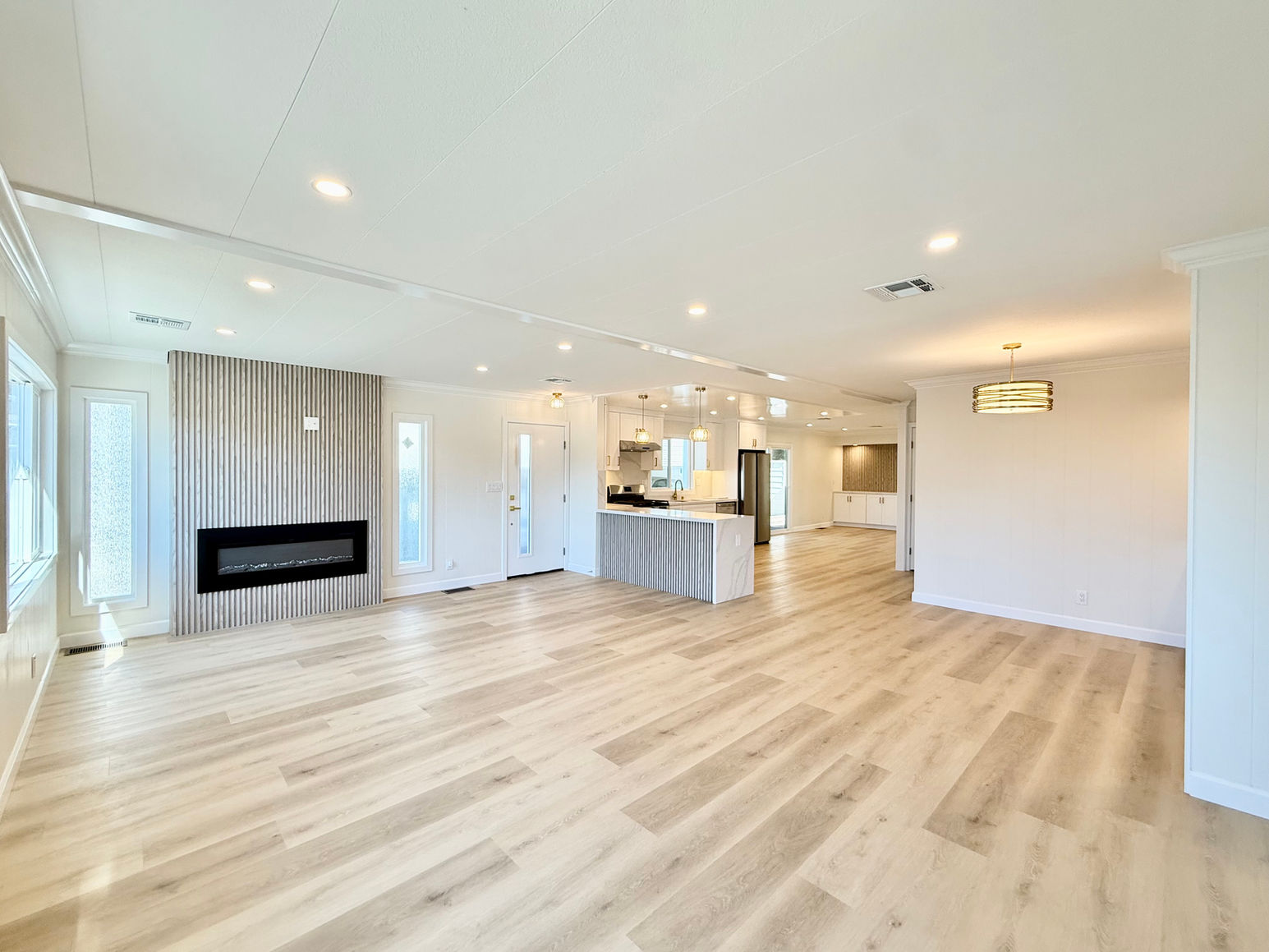 Step inside to discover a large open concept living space adorned with custom lighting and luxury vinyl plank flooring that flows seamlessly throughout. The elegant electric fireplace adds a cozy touch, while the built-in bar area with wine storage is perfect for entertaining family and friends. The gorgeous remodeled kitchen features custom quartz counters with a stunning waterfall edge, all stainless steel appliances, and white shaker-style cabinets with brass fixtures for a touch of sophistication. The primary bedroom offers ample closet space with built-in features and a private entrance to the covered patio. The luxurious primary bath, complete with a double vanity setup and a full-size step-in shower, is a true sanctuary. With thoughtful design and attention to detail, this home is a perfect haven for seniors seeking a vibrant, low-maintenance lifestyle in the heart of Forest Gardens.