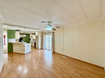 Welcome to your beautifully remodeled 2-bedroom, 2-bath mobile home, situated on an oversized lot with a generous yard that provides plenty of outdoor space for relaxation and a mature lemon tree. Spanning an impressive 1,488 sq. ft., this stunning residence features a chef's kitchen that is truly the heart of the home, complete with custom quartz countertops, stylish backsplash, and a top-of-the-line Wolf stove top, perfect for culinary enthusiasts. The open floor plan seamlessly connects the living spaces, creating an inviting atmosphere for entertaining and relaxation. Step onto the relaxing porch, adorned with elegant square posts and vinyl lattice, where you can unwind and enjoy the fresh air. The double master setup offers a private bathroom for each bedroom, making this home ideal for guests or a roommate situation. The oversized master bedroom suite features a master bath with separate sinks and a large walk-in closet.
