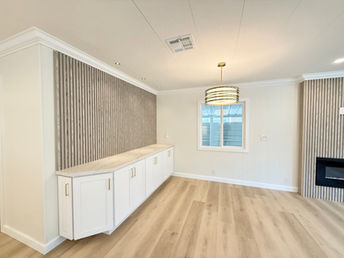 Step inside to discover a large open concept living space adorned with custom lighting and luxury vinyl plank flooring that flows seamlessly throughout. The elegant electric fireplace adds a cozy touch, while the built-in bar area is perfect for entertaining family and friends. The gorgeous remodeled kitchen features custom quartz counters with a stunning waterfall edge, all-stainless-steel appliances, and white shaker-style cabinets with brass fixtures for a touch of sophistication. The primary bedroom offers ample closet space with built-in features and an elegant en suite. The luxurious primary bath, complete with a double vanity setup and a full-size step-in shower, is a true sanctuary. With thoughtful design and attention to detail, this home is a perfect haven for seniors seeking a vibrant, low-maintenance lifestyle in the heart of Lake Forest.