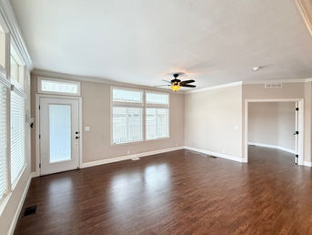 Nestled in a serene setting, this exquisite 2015 Silvercrest Manufactured Home seamlessly combines modern elegance with traditional charm. Boasting two spacious bedrooms and a large den accessed through French doors, this home offers ample space for relaxation and productivity. The open-concept living and dining areas flow seamlessly into the large chef’s kitchen, featuring a center island, elegant dark wood cabinets, Corian-style countertops, and stainless steel appliances, complete with a hidden coffee nook. The high coffered ceilings and custom light fixtures enhance the ambiance, while beautiful laminate floors grace the living areas. Double-pane vinyl windows flood the space with natural light, creating an inviting atmosphere.