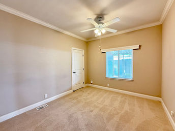 Step outside to enjoy the back patio with stunning hillside views or relax on the large covered front and side porches. The manicured front bed and low-maintenance exterior add to the home's curb appeal. The oversized covered parking accommodates two vehicles and includes privacy screening, while a large storage shed provides additional space. Inside, custom ceiling fans in each room ensure comfort, and the laundry room offers convenience with a washer, dryer, and ample storage. The primary suite is a sanctuary with custom ceiling treatments and an elegant bathroom featuring a double-sink vanity, linen closet, and a large step-in shower. A convenient guest bath with a combination tub and shower completes this home's thoughtful design, making it perfect for both entertaining and everyday living.