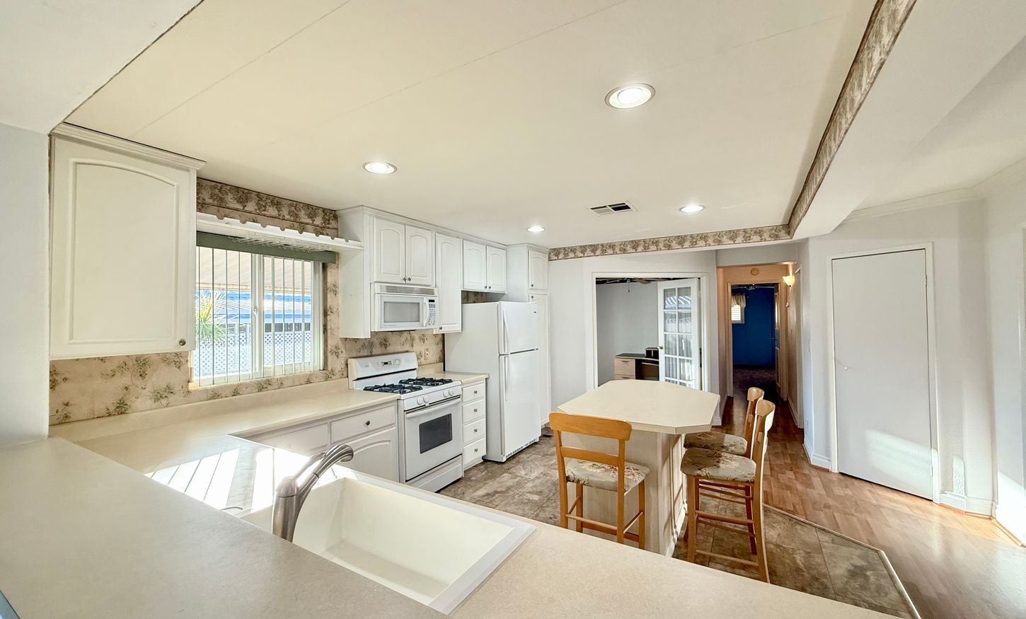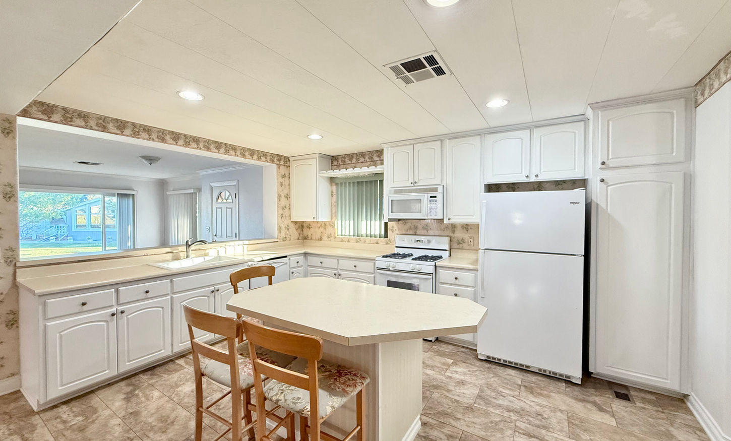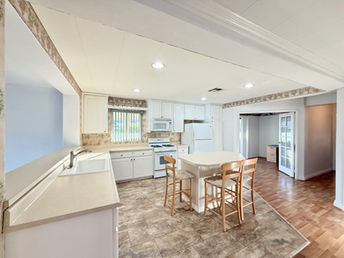 Welcome to your future haven at Forest Gardens Mobile Home Community, where serene lake views and a vibrant community await you! This 2-bedroom mobile home is a fantastic opportunity for those looking to customize their dream space, featuring 1,440 square feet of potential. Enjoy picturesque lake views from the covered porch, living room, dining room, and kitchen, making it the perfect spot for morning coffee or evening relaxation. The home boasts a cozy living area, a dining room, and a kitchen equipped with white appliances, a center island, and ample cabinetry for all your culinary needs. With two full bathrooms and an additional office or den, this versatile layout offers extra space for hobbies, guest accommodations, or a quiet reading nook.