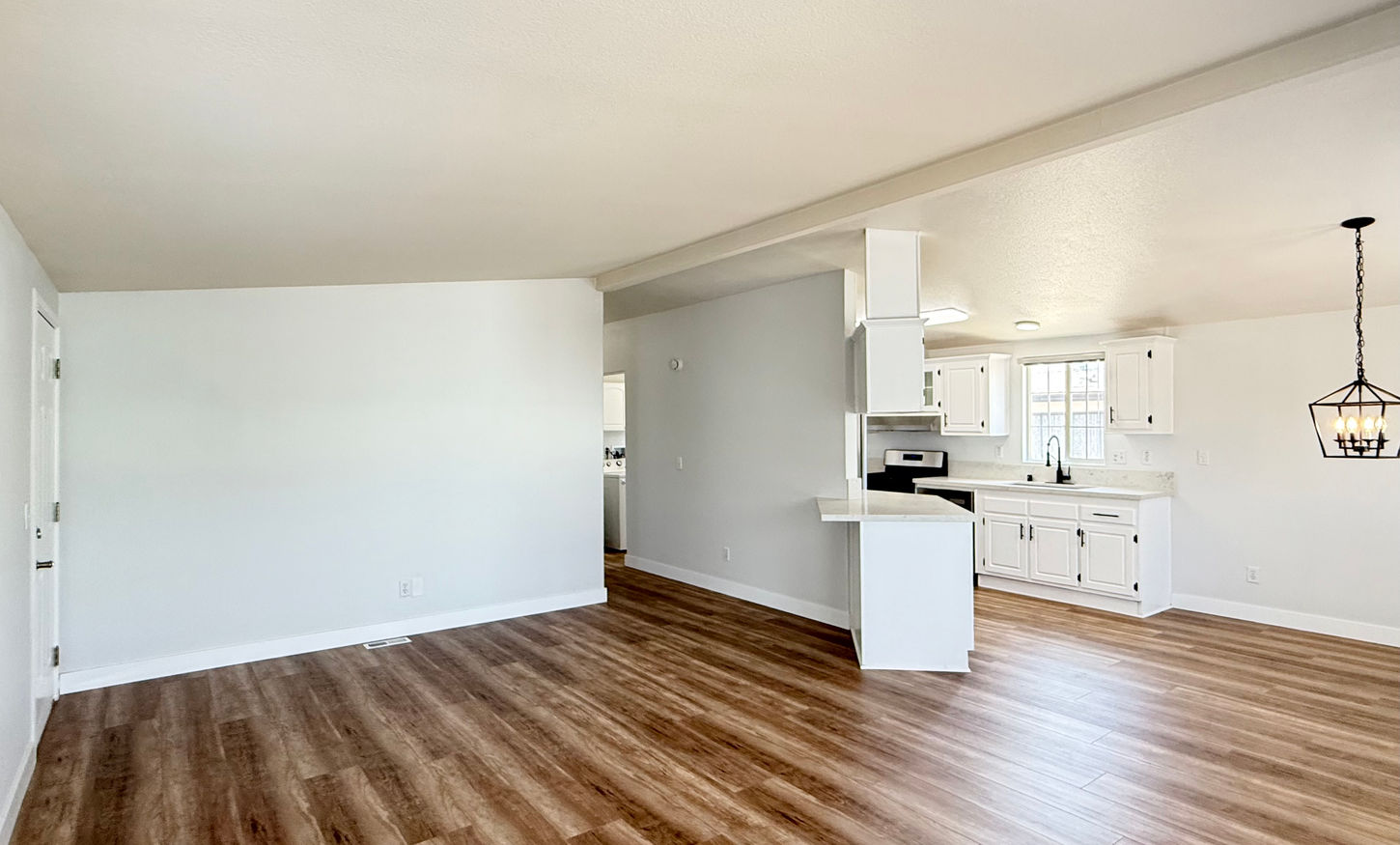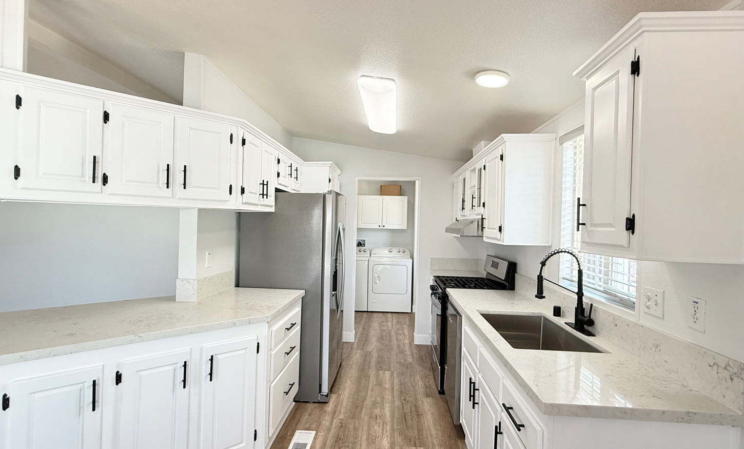 Welcome to your newly remodeled 3-bedroom, 2-bathroom home in the heart of Anaheim! This spacious 1,248 sq. ft. residence offers modern comfort and convenience with a large 2-car garage and ample parking for at least 5 vehicles. Step inside to discover an open concept living area with vaulted ceilings, luxury vinyl plank flooring throughout, and custom lighting fixtures that create a warm and inviting atmosphere. The stunning kitchen features white cabinets with sleek black hardware, beautiful quartz countertops with a breakfast bar, and all-new stainless steel appliances—including a side-by-side fridge, stove, dishwasher, and a stylish farm sink. Enjoy year-round comfort with a brand new A/C unit and the convenience of an indoor laundry room complete with washer and dryer.
