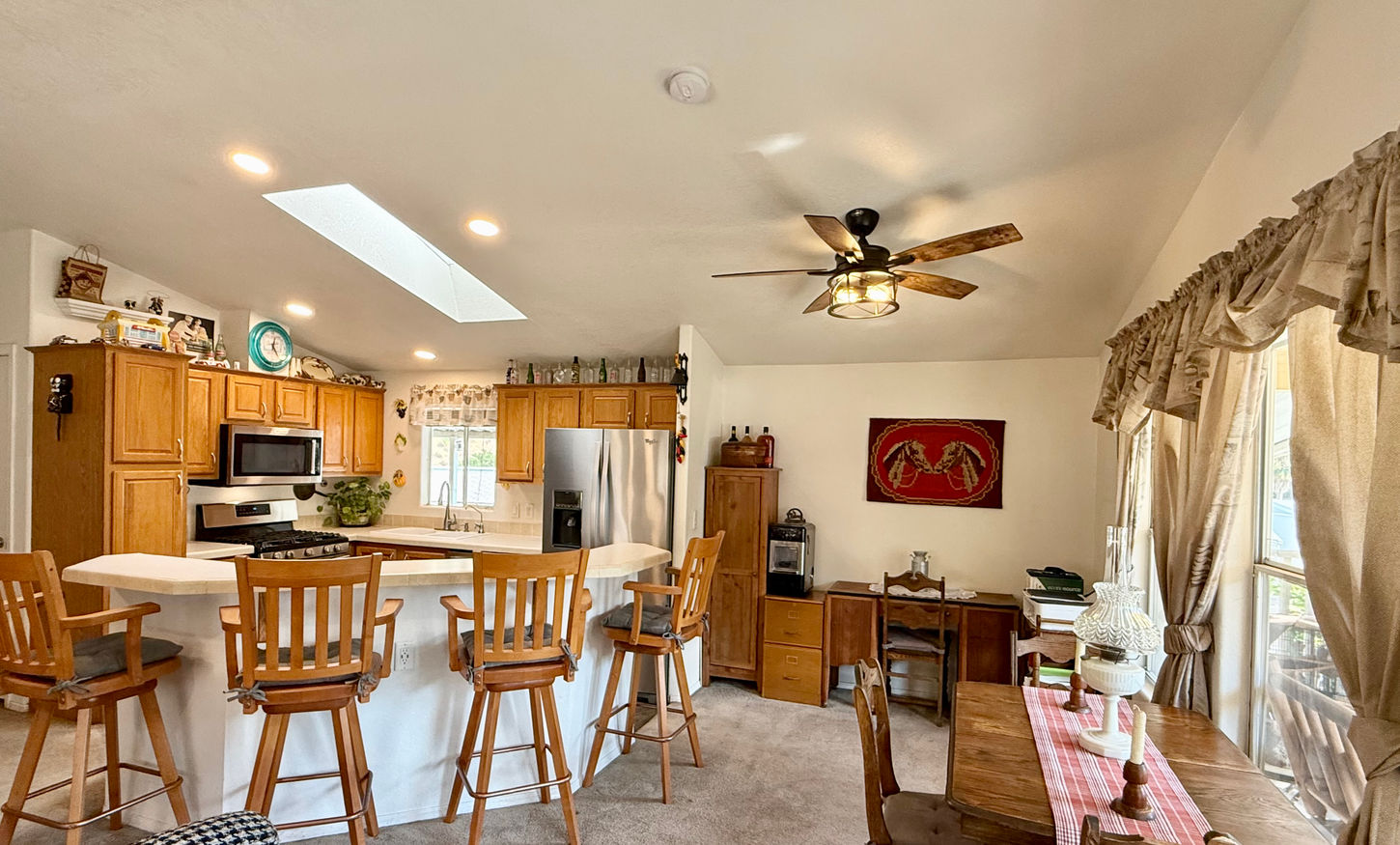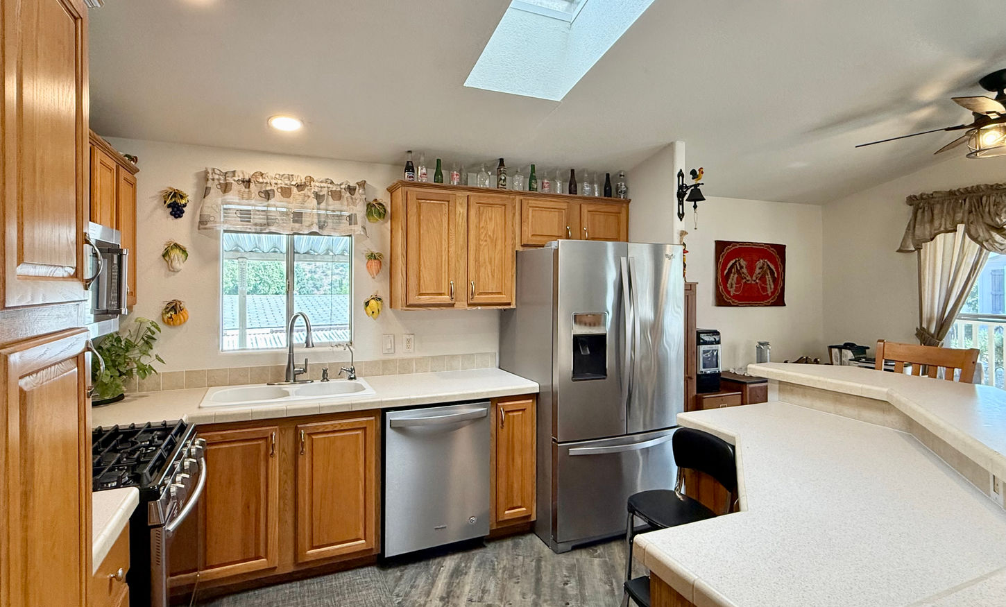 Nestled in the scenic community of Carbon Canyon in Brea, this beautifully maintained 2004 Champion Home Builders residence offers 3 spacious bedrooms and 2 baths across 1,392 sq. ft. of open concept living. Enjoy vaulted ceilings, dual pane windows, a bright kitchen with skylight, stainless steel appliances, beautiful oak cabinets, and a bar-height center island perfect for entertaining. The large primary suite features a walk-in closet and luxurious en-suite bath with dual sinks, soaking tub, and step-in shower, while custom fixtures, a $10,000 tankless water heater, and convenient indoor laundry add to this home’s comfort and value. Relax in the large living room or on your covered front porch with a cascading water feature, and take in mountain views from every direction.